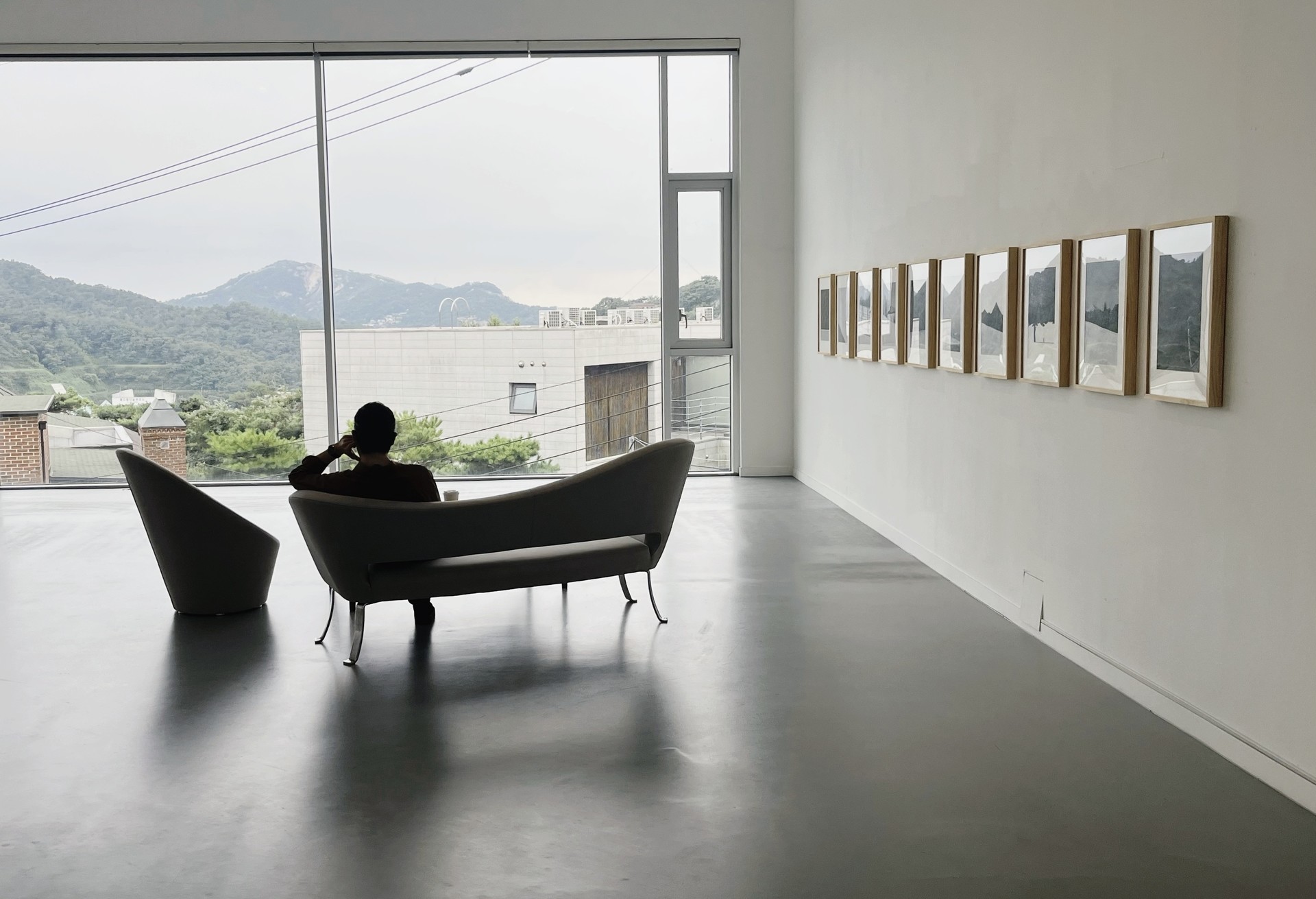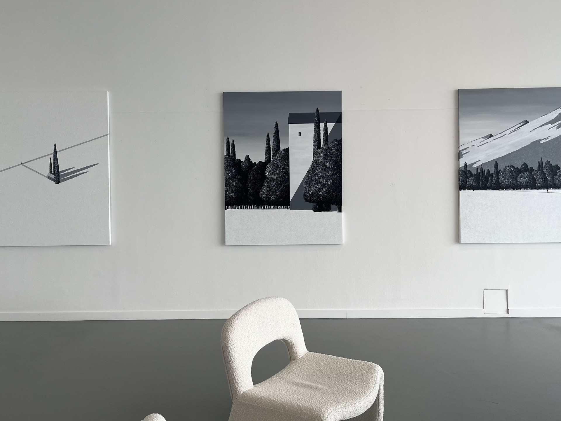 광활한 풍경과 절제된 색, 간결한 구도 위를 걷는 인물과 그 뒤로 길게 드리운 그림자는 이중적인 감각을 불러일으킵니다. 카페 창가 너머로 바라보는 바다나 높은 곳에서 내려다본 지평선은 안정감과 평온함을 주지만, 정작 드넓은 바다 한가운데나 끝없는 들판 위에 서게 되면 거대한 자연의 압도적인 기운 속에서 불안과 막막함이 엄습하기도 합니다. 이렇게 작가의 작품을 바라보며 과거와 현재의 내면 속 흔들리는 순간을 발견하게 됩니다.